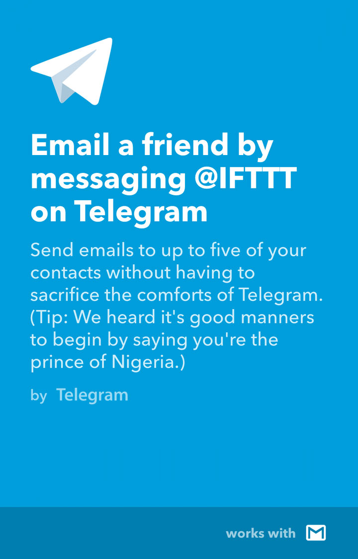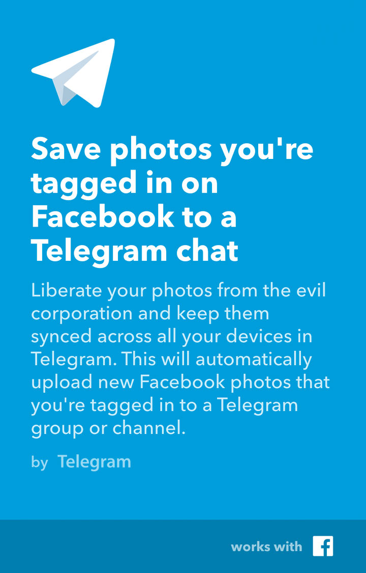 Starting today, you can link your Telegram account with more than 360 other services by setting up “If This Then That” integrations (or “Applets”). This works with anything from social networks like Twitter and Instagram, to productivity tools like Gmail or Pocket, entertainment apps like Spotify or Pinterest, cloud services like Dropbox or Google Drive, and Internet of Things devices like Nest, LIFX, or Philips Hue.