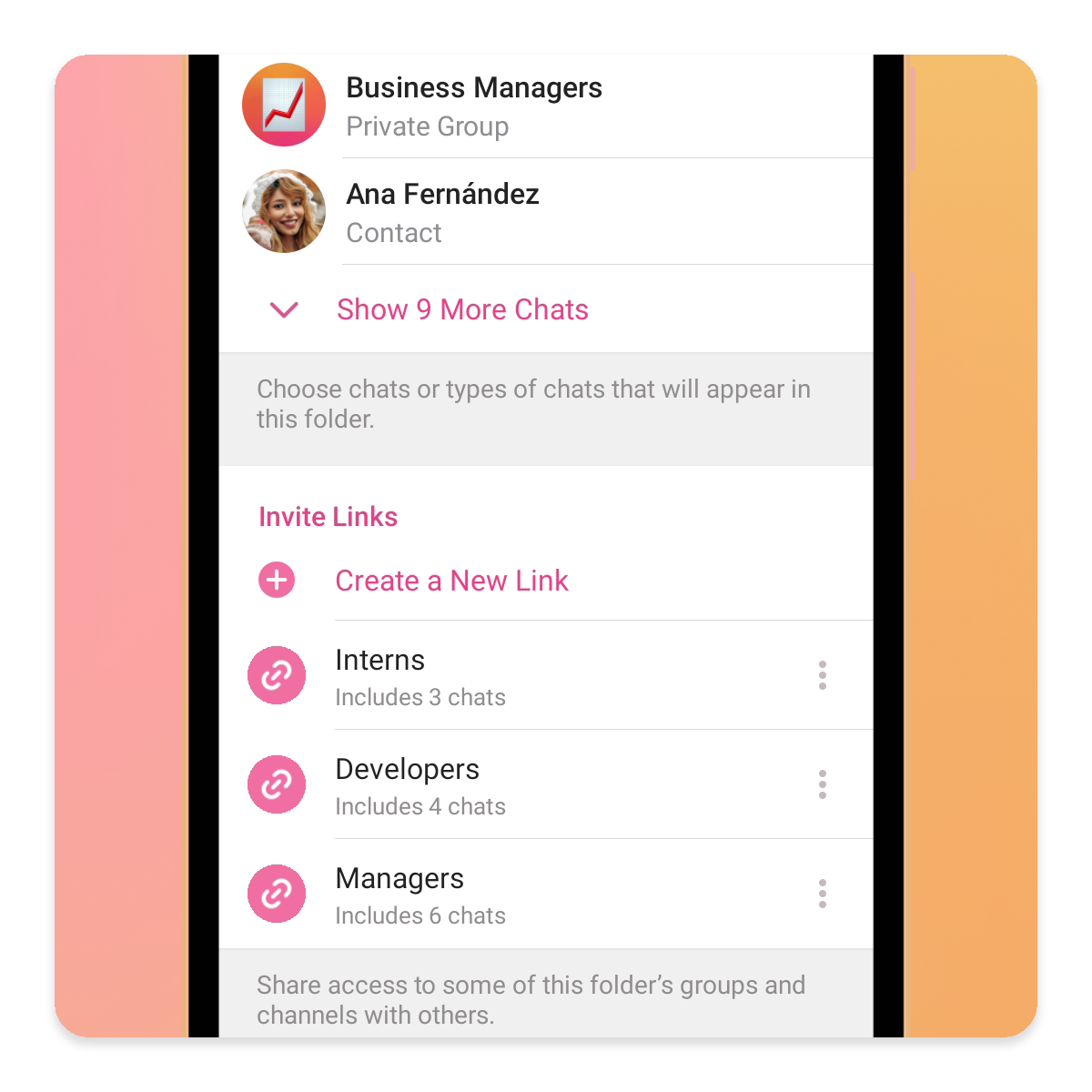 می‌توانید تا ۱۰۰ لینک دعوت مختلف برای پوشه‌ها بسازید که هرکدام، دسترسی متفاوتی از گفتگوهای درون پوشه را به کاربر بدهند. برای نمونه، می‌توانید یک لینک با عنوان «مدیر» بسازید که به تمامی گفتگوهای پوشه‌ی «کار» دسترسی داشته باشد، و یک لینک با عنوان «کارآموز» نیز بسازید که تنها به ۲ یا ۳ گفتگو دسترسی دارد.