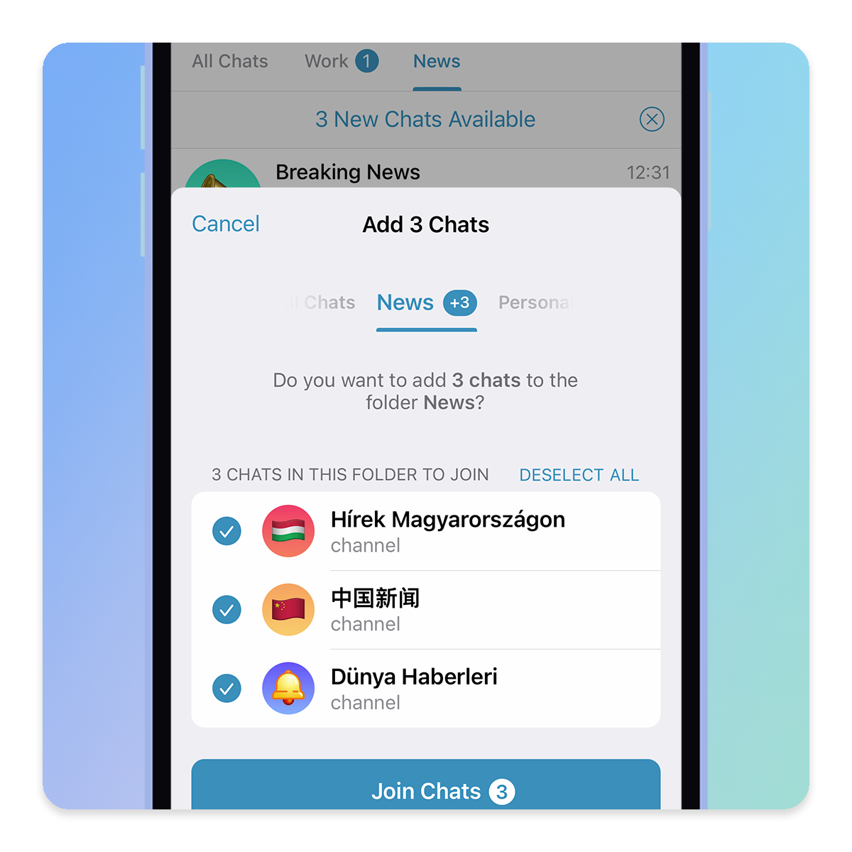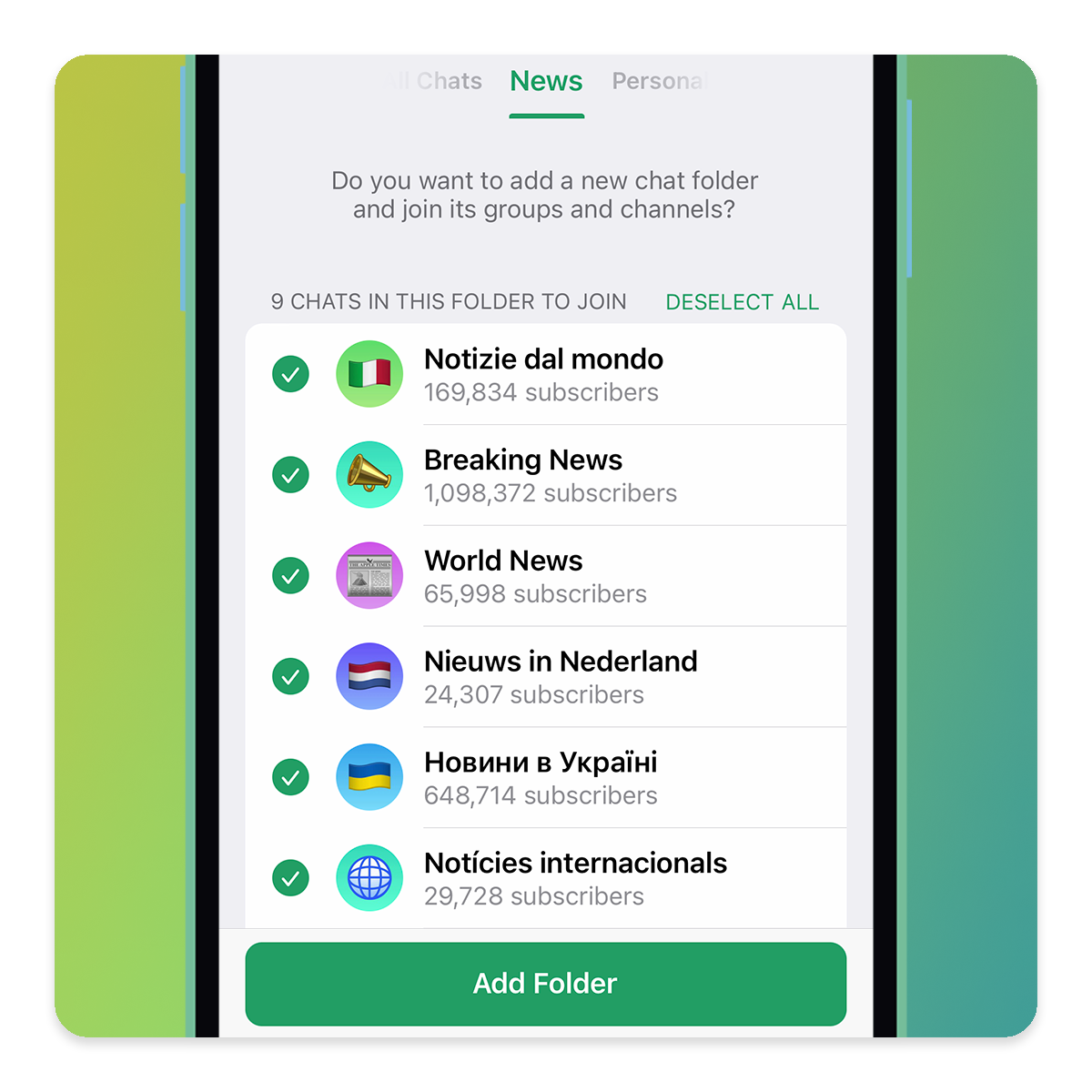 کاربران می‌توانند به راحتی پوشه‌های گفتگوی سفارشی متشکل از ۲۰۰ گفتگوی مختلف ساخته و با یک لینک ساده، آن را با دوستان، همکاران و یا دنبال کنندگان خود به اشتراک بگذارند. مخاطبین آن‌ها نیز می‌توانند با یک دکمه، بلافاصله به تمامی گروه‌ها و گفتگوهای درون پوشه بپیوندند.