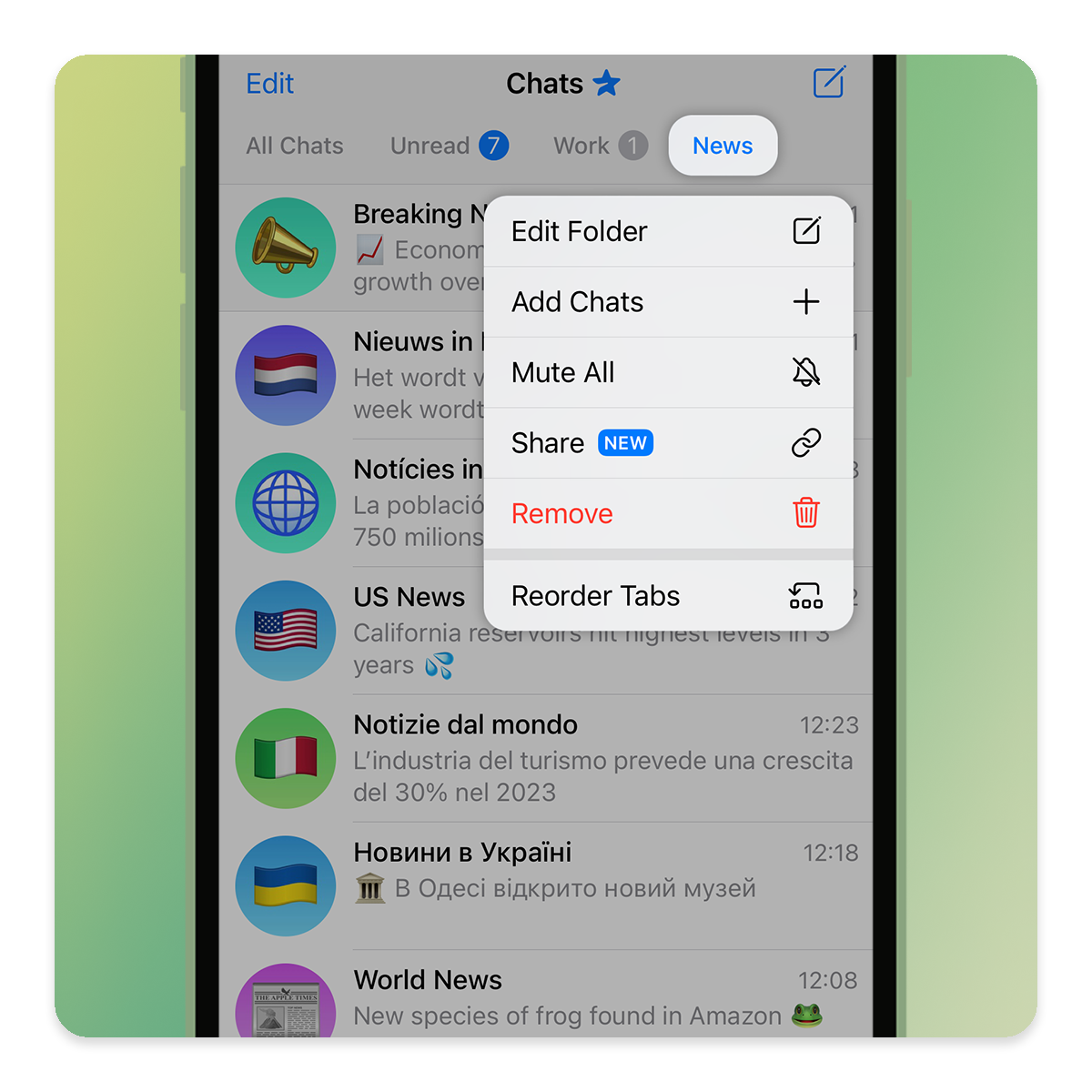 برای به اشتراک گذاشتن پوشه‌های خود، در فهرست گفتگوها دست خود را روی نام پوشه نگه داشته و گزینه‌ی «به اشتراک گذاری» را انتخاب کنید (این گزینه، از مسیر تنظیمات > پوشه‌های گفتگو نیز قابل دسترسی است). با انتخاب این گزینه، یک لینک دعوت برای پوشه‌ی شما ساخته خواهد شد. سپس می‌توانید گفتگوهایی که از طریق این لینک برای افراد قابل دسترسی هستند را تعیین کنید.
